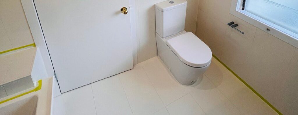 Yellow tape was applied along all edges, skirtings, fixtures and around the vanity to protect surrounding surfaces.